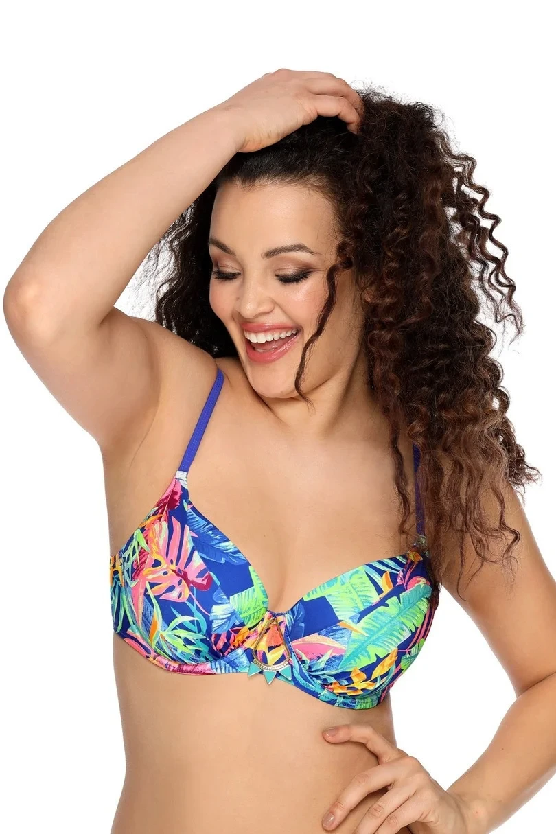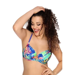 Pestrobarevná podprsenka SK 143 je typickým příkladem horkého léta! Pastelové a neonové barvy v podobě květinového potisku na chrpovém pozadí soupeří o hlavní pozornost s efektní ozdobou v boho stylu umístěnou mezi prsy. Plavková podprsenka SK 143 pohodlně shromažďuje prsa ve vyztužených košíčcích a zvýrazňuje svůdný dekolt.