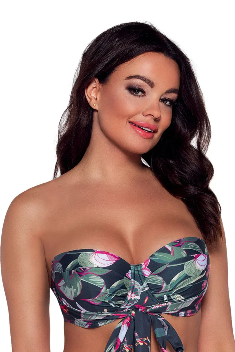 Poznaj zmysłową bardotkę SK 167, która zachwyca egzotycznym, kwiecistym wzorem na tle głębokiego granatu. Idealna na plażę i basen, doskonale podkreśla dekolt i zapewnia wsparcie dzięki wszytemu szerokiemu pasowi. Daje możliwość odpięcia ramiączek oraz elastyczność wiązania – możesz zawiązać ją klasycznie z tyłu, na karku lub ozdobnie z przodu w formie kokardy. Wysokojakościowa dzianina przypomina malarskie płótno, nadając całości wyjątkowo elegancki i tropikalny charakter. Do zestawu świetnie pasują klasyczne figi SF 167/12 lub brazyliany 167/5, tworząc komplet, który sprawi, że poczujesz się kobieco i stylowo w każdej letniej stylizacji.