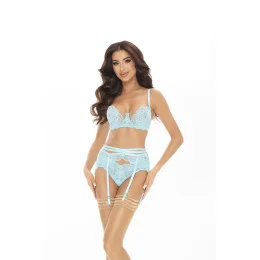 Měkká podprsenka, celá vyrobená z modré krajky s květinovým motivem. Díky použití jemného průhledného tylu na košíčcích jsou prsa dokonale tvarovaná. Půvab jí dodávají malé modré mašličky.