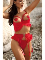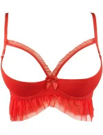 Podprsenka "Peek a boo" V-9971 v zářivě červené barvě okouzluje vzdušnými, hravými volánky, které jemně spadají přes poprsí a svůdně zvýrazňují jeho tvar. Zdánlivě nevinný půvab podtrhuje saténová mašlička mezi košíčky. Je to překvapivá, vášnivá nabídka, která rozproudí vaši představivost a zanechá ve vás neodolatelný pocit. Zvlášť když efekt umocníte podvazkovým pásem V-9972 a tangy V-9978.podprsenka s třístupňovým nastavitelným zapínáním na háčky a oka.