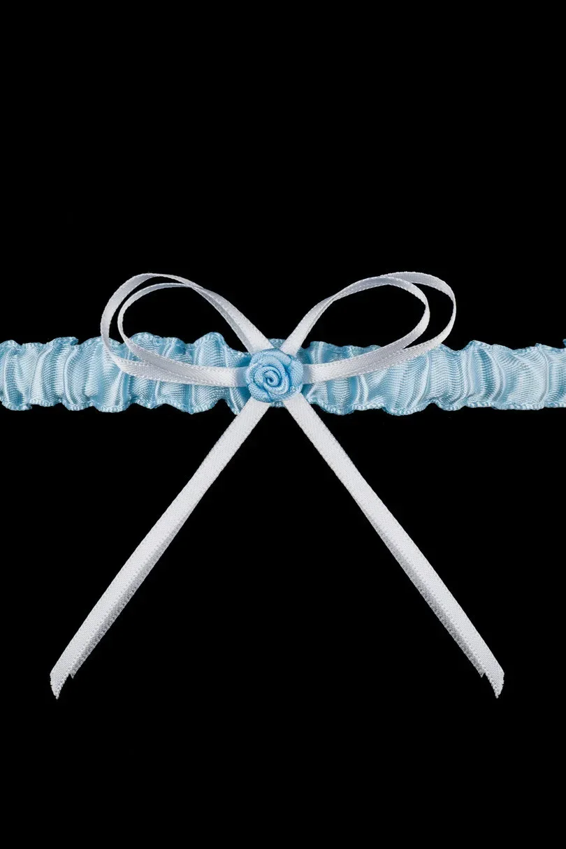 Modrý saténový podvazek s mašlí zdobenou třpytivým křišťálem.