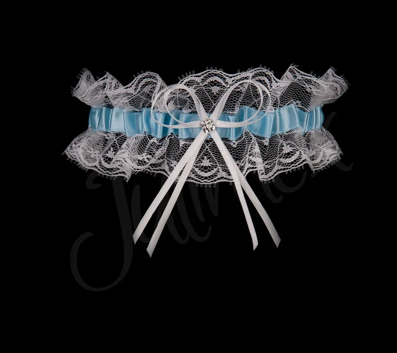 Bílý krajkový a modrý saténový podvazek zdobený mašlí s třpytivým krystalem.