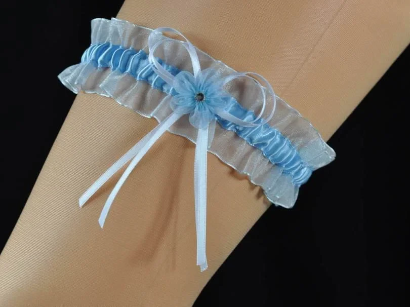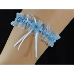 Modrý podvazek z tylu a saténu zdobený květinovou mašlí s třpytivými flitry.