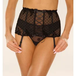 Podvazkový pás, který je vyrobený z krajky a jemné síťoviny s puntíkovaným vzorem typu "Flock".