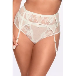 Podvazkový pás vyrobený ze síťoviny, zapíná se na třípolohové zapínání na háčky a očka, přední díl zdobí květinová krajka.