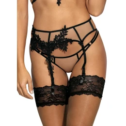 | Průhledný podvazkový pás V-8842 s černým vyšívaným motivem je jedinečným návrhem. Podvazkový pás zvýrazní pas a oblost boků. V kompletu s podprsenkou V-8841 a stringem V-8848 vypadá krásně. |