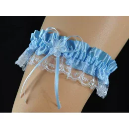 Modrý saténový a bílý krajkový podvazek zdobený jemným perlovým květem.
