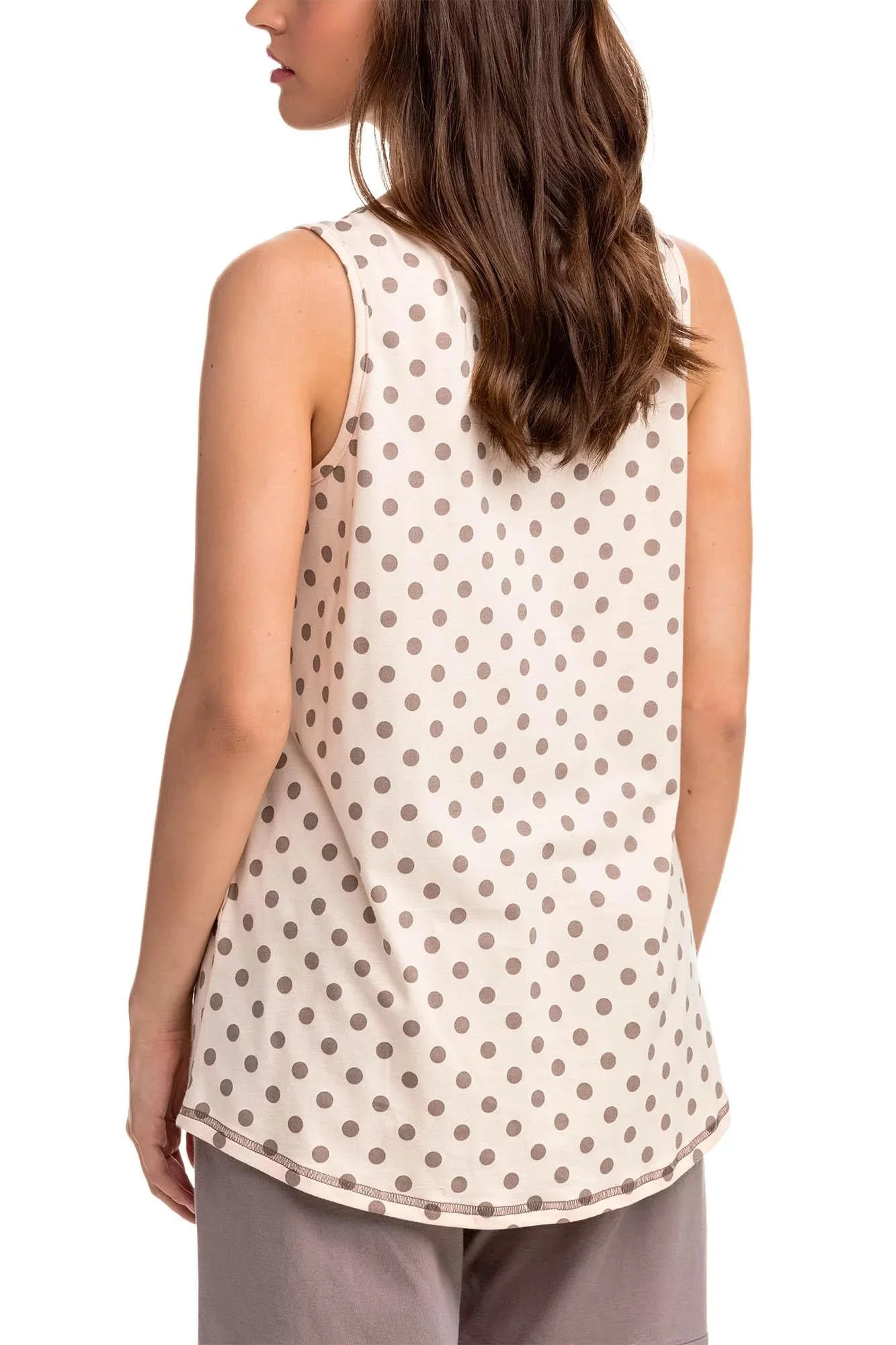Pohodlné dvoudílné dámské pyžámko pro sladké spaní i pro krásné chvíle. Komplet sestává z košilky s puntíkovým vzorem, který dopňují jednobarevné kraťasy. Toto dámské pyžamo je vyrobené z vysoce kvalitní, genetický nemodifikované 100 % přírodní řecké bavlny, která poskytuje vysoké pohodlí, příjemný pocit na dotek, prodyšnost a odolnost.