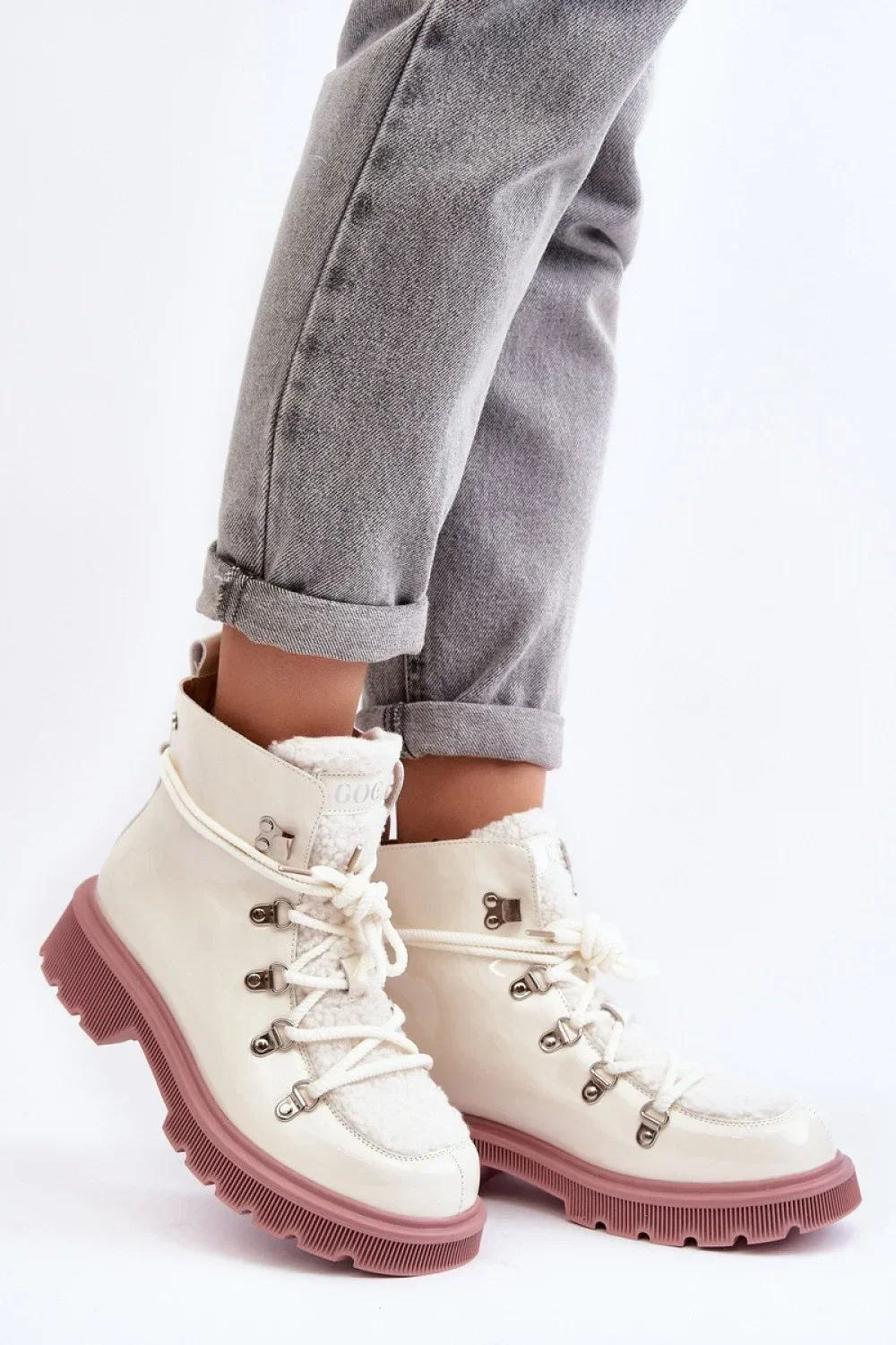 Dámské trapery od značky GOE. Vyrobeno z přírodní kůže. Posazené na plochém podpatku. Šněrovací model. Přední část zdobená ovčí kůží. Zaoblená špička. Vyztužená pata. Uvnitř zateplená přikrývkou na boty. Klasický model, který využijete k mnoha podzimním a zimním outfitům!