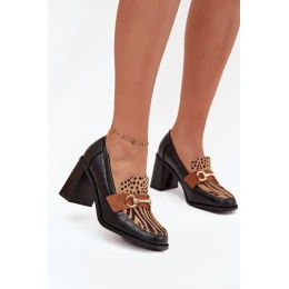 Polobotky pro ženy vyrobené z elegantní ekokože jsou stylovou volbou pro mnoho příležitostí. Umístěné na stabilním sloupkovém podpatku zaručují pohodlí při nošení a zároveň dodávají postavě lehkost. Klasické, zaoblené špičky dělají boty decentní a ženské, zatímco ozdobné tisknutí jim dodává jedinečný charakter. Přitažlivosti celku dodává zlatý detail, který představuje elegantní akcent a zdůrazňuje moderní styl obuvi. Toto je model, který se skvěle hodí jak do každodenních outfitů, tak i do formálnějších stylizací, spojující pohodlí s nadčasovou elegancí.