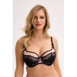 Poczuj moc idealnie wymodelowanego biustu w wyjątkowym biustonoszu typu semi-soft, który łączy elegancję z perfekcyjnym podtrzymaniem. Miseczki wykonane z subtelnej, różowej siateczki i ozdobione czarną, dekoracyjną koronką pięknie eksponują dekolt. Górna część miseczki płynnie łączy się z ramiączkiem, tworząc efekt naturalnego uniesienia i doskonałego dopasowania. Dodatkowe pionowe cięcia w usztywnianej dolnej części miski modelują i unoszą piersi, zapewniając komfort oraz atrakcyjny kształt. To biustonosz stworzony z myślą o kobietach, które chcą wyglądać zmysłowo i czuć się pewnie każdego dnia.