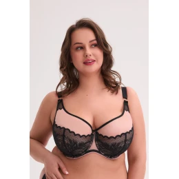 Zachwyć się nowoczesną elegancją w czarno-różowym biustonoszu semi soft z głęboką miską. Ten model to idealne połączenie subtelności i wsparcia – jasnoróżowa baza miseczki kontrastuje z czarnym haftem, tworząc hipnotyzujący efekt optyczny. Głęboka miska pięknie zbiera i formuje biust, a miękka, dolna część została płynnie połączona z szerokim, stabilnym ramiączkiem, które gwarantuje komfort noszenia nawet przez cały dzień. Model stworzony z myślą o kobietach o pełniejszym biuście, które nie chcą rezygnować z luksusu i zmysłowego wyglądu.