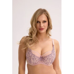 Biustonosz w konstrukcji SS10 to bestsellerowy model, który łączy kobiecy design z doskonałą funkcjonalnością. Górna część miseczek wykonana jest z lekkiego, stabilnego tiulu wykończonego ozdobną taśmą, a dolna – z cienkiej pianki gorseciarskiej pokrytej elastyczną koronką o finezyjnym, lawendowym hafcie. Pionowe cięcie w dolnej części miski gwarantuje świetne dopasowanie do kształtu piersi, zaokrąglając je i delikatnie unosząc. Zabudowany krój z podwyższonym mostkiem i półotwartą linią dekoltu sprawia, że piersi są dobrze utrzymane na miejscu, nawet przy większym rozmiarze. Tył wykonany z elastycznego tiulu zapewnia komfort, a boczne fiszbiny oraz druty okalające pierś dbają o solidne podtrzymanie. Model idealny do codziennego noszenia i wyjątkowych stylizacji.