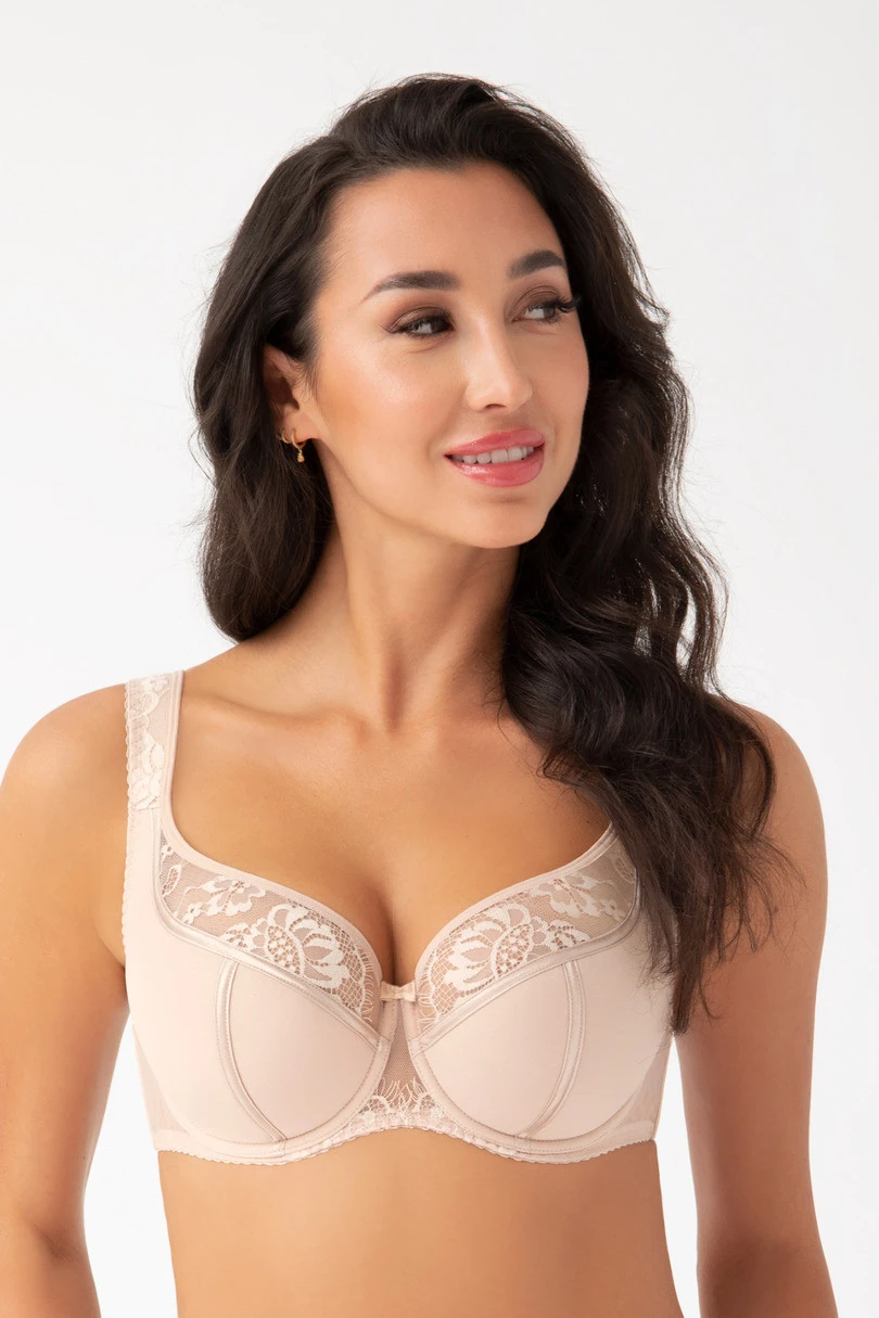 Beżowy biustonosz o klasycznym, zabudowanym kroju. Model ma miękkie, profilowane miseczki, które zapewniają naturalne ułożenie biustu i stabilne podtrzymanie. Górna część miseczek została ozdobiona delikatną koronką o kwiatowym wzorze, nadającą całości lekkości i kobiecego charakteru. Przy dekolcie oraz na mostku znajdują się subtelne, półtransparentne wstawki, które podkreślają linię biustu i dodają bieliźnie elegancji. Ramiączka są szersze i komfortowe, co sprzyja wygodzie noszenia na co dzień. Neutralne tło uwydatnia beżowy kolor oraz detale wykończenia.
