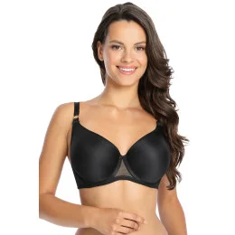 Skvěle padnoucí černý model s designem M10. Díky tepelně tvarovaným košíčkům nemá podprsenka na košíčcích žádné švy a nedráždí jemnou pokožku prsou. Zadní díl je vyroben z kabaretu, podšitého jemnou elastickou síťovinou. Nedráždí pokožku, žádné boční velrybí kosti, měkký obvod. Střední výška spolu s košíčky vytváří tulipánovitý výstřih, který dokonale odhaluje prsa.