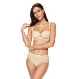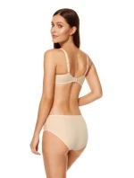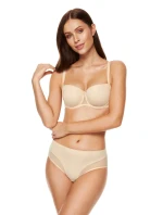 Tenké korzetové misky z pěny potažené z vnější strany hladkou pleteninou. Mezi košíčky je malá ozdobná mašlička. Vnitřní část košíčků je potažena bavlnou podle normy OEKO-TEX, takže jsou šetrné k pokožce. Zadní část podprsenky je vyrobena z elastického tylu. Svislé boční velrybí kostice stabilizují obvod podprsenky. Podprsenka byla navržena a ušita v Polsku.