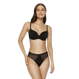 Vyztužená podprsenka v černé barvě. Trojdílné misky z tenké korzetové pěny potažené z vnější strany reliéfní kostkovanou látkou. Vnitřní strana košíčků je potažena bavlnou podle normy OEKO-TEX, takže jsou šetrné k pokožce. Svislé boční velrybí kostice stabilizují obvod podprsenky. Zadní část podprsenky je vyrobena z tylu. Podprsenka byla navržena a ušita v Polsku.