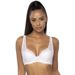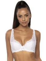 Dámská vyztužená podprsenka. Košíčky a můstek jsou vyrobeny z krásné krajky. Mezi košíčky je saténová mašlička s visačkou. Ramínka nastavitelná, neodepínací, prodloužená, krajková. Ramínka podpírají a tvarují prsa, zadní část z krajky. Bez bočních velkých kostic.