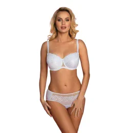 Elegantní klasická vyztužená podprsenka. Horní část košíčků je pokryta výšivkou, spodní část košíčků je vyrobena ze vzorované saténové látky. Bez svislých bočních velkých kostic, mezi košíčky mašlička s visačkou, síťovaný můstek. Nastavitelná, odepínací ramínka, síťovaná zadní část, zapínání na háčky na zádech.