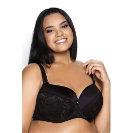 Podmanivá a elegantní podprsenka Hannah s vyztuženými košíčky. K dostání v sytě černé a bezchybné bílé barvě, která dodá vašemu poprsí přirozený, svůdný tvar. Košíčky jsou ve spodní části zdobené fenomenální, lehce lesklou krajkou a v horní části jemným mikrovláknem. Zadní díl je vyroben z lycrového úpletu. Mezi košíčky je bižuterní přívěsek, který prádlo krásně rozzáří. Bez ramínek, nastavitelná ramínka. Dvouřadé zapínání na háčky a očka s třístupňovou regulací.