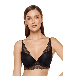 Podprsenka s pevnými košíčky v černé barvě. Úplně nová konstrukce typu plunge s hlubokým středem, která jemně zvedá a sbírá poprsí. Pevné košíčky vyrobené z korzetové pěny potažené krajkou v jemně lesklém květinovém vzoru. Vnitřní část košíčků potažena bavlnou s certifikátem OEKO-TEX, díky čemuž jsou šetrné k pokožce. Zadní část podprsenky je vyrobena z krajkové látky. Svislé boční kostice stabilizují obvod podprsenky. Podprsenka byla navržena a ušita v Polsku.