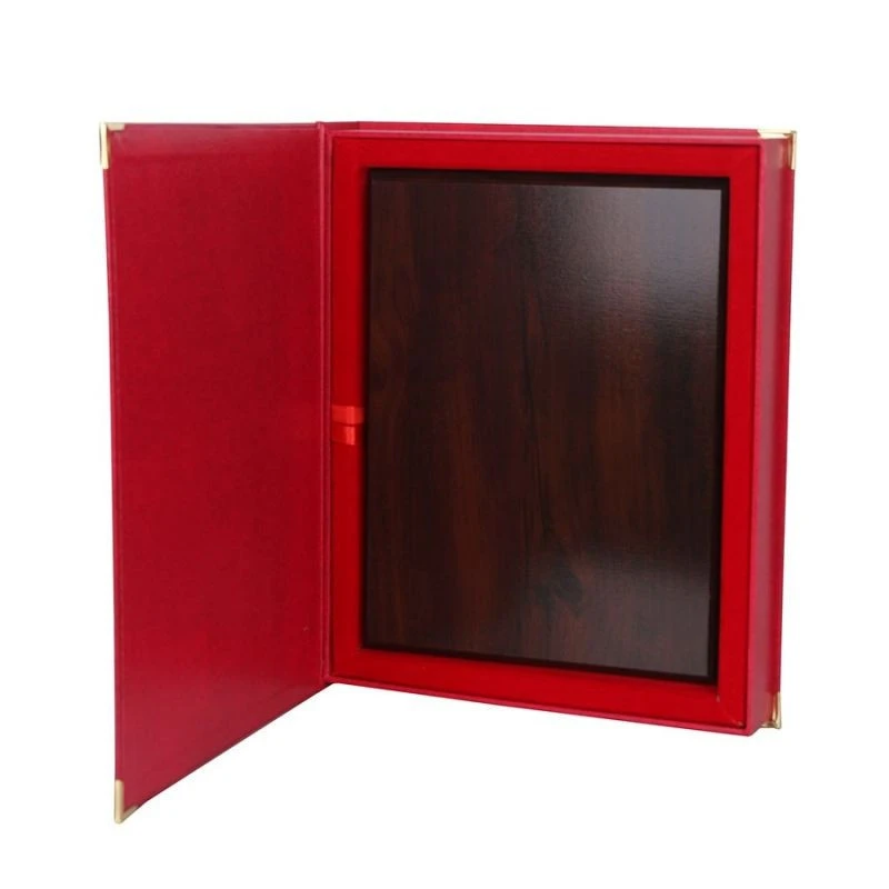 Pouzdro je k dispozici ve čtyřech barvách: - červená - modrá - zelená - hnědá a ve čtyřech velikostech: 30,5 x 23 cm 25,5 x 20 cm 23 x 18 cm 20 x 15 cm Díky kovovým prvkům má pouzdro zesílené rohy, které ho zároveň krásně zdobí. Uvnitř je vyloženo měkkým velurem v barvě pouzdra a stuha připevněná uvnitř umožňuje snadné vyjmutí podkladu zevnitř. Pouzdro lze prezentovat plaketou ve svislé i vodorovné poloze. Je ideální pro: výročí, poděkování, certifikáty, vyznamenání atd. Plakety na dřevěném podkladu vyrábíme sublimační metodou v barvě. Pro návrhy plakety kontaktujte prosím oddělení plakety.