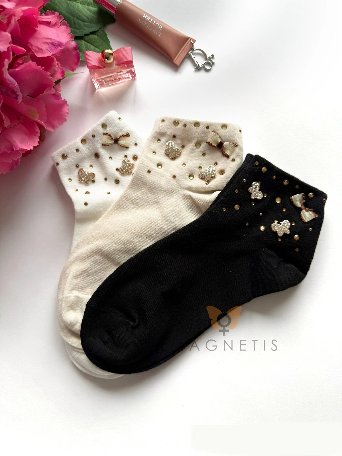 - lem je zdobený lesklými motýlky, mašličkou a zirkony