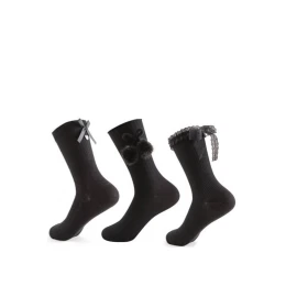 Każda para wyróżnia się efektownym, wypukłym wzorem lub subtelnym prążkiem, a dodatkowe ozdoby – takie jak pompony, koronka lub serduszka – dodają im uroku i wyjątkowego charakteru. Skarpetki dostępne są w klasycznym kolorze czarnym, co sprawia, że świetnie komponują się z każdą stylizacją – zarówno elegancką, jak i casualową.