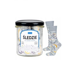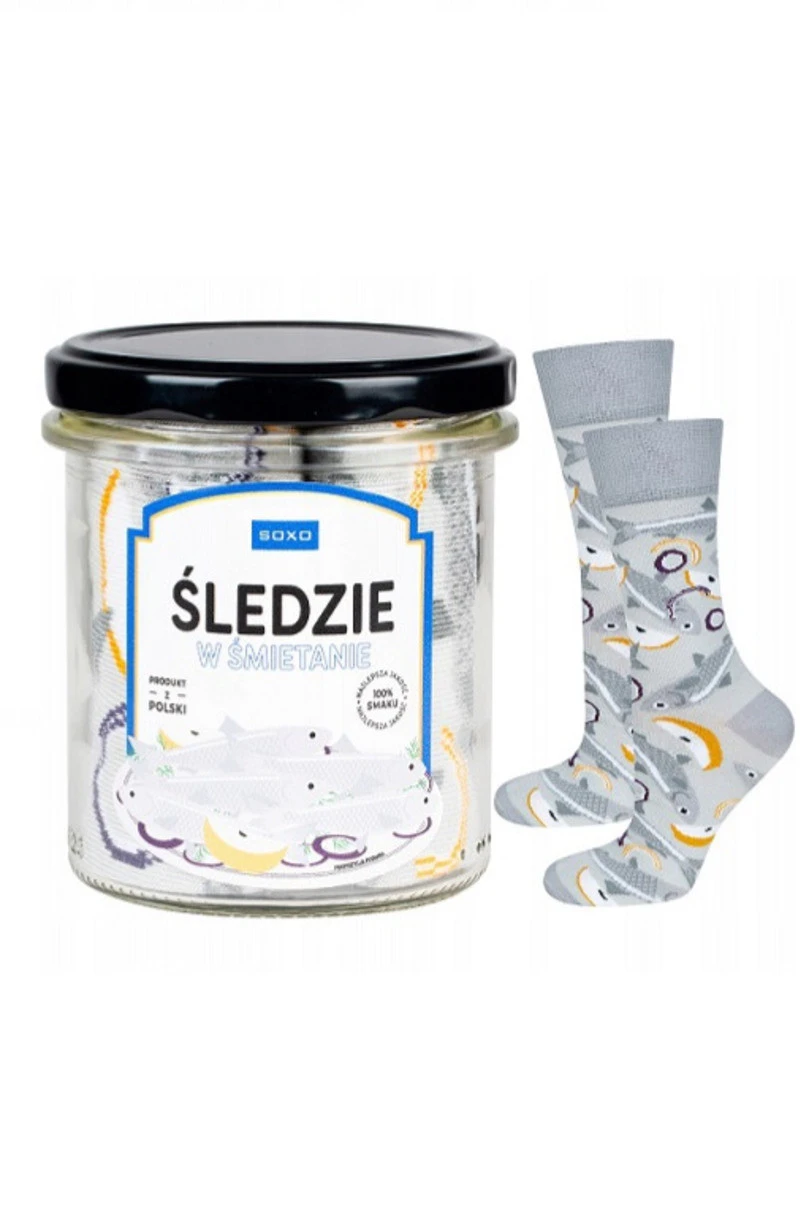 - Jedyne w swoim rodzaju śledzie od Soxo. Wyobraź sobie moment, w którym otwierasz słoik, a w nim znajdujesz mięciutkie skarpetki z motywem śledzi. To świetny pomysł na prezent! Skład surowcowy: 80% bawełna, 15% poliamid, 5% elastan.
