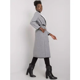 Šedý melanžový kabát s kapsami a páskem.