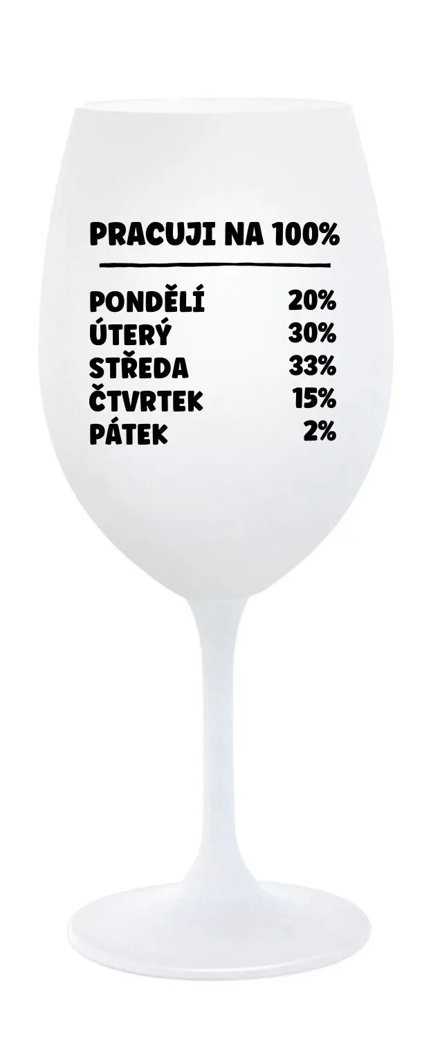 Vinná bílá sklenice s originálním motivem PRACUJI NA 100% je krásným a osobitým dárkem, které ale využijete i Vy sami třeba ve chvílích, kdy si budete chtít zpříjemnit náročný den. Tyto originální vinné sklenice jsou totiž nejen pro výjimečné události, ale i pro běžné večery, které si chcete zpříjemnit sklenkou dobrého vína. Jistě proto potěší každého milovníka vína, i toho, kdo si umí svůj život vychutnat plnými doušky.