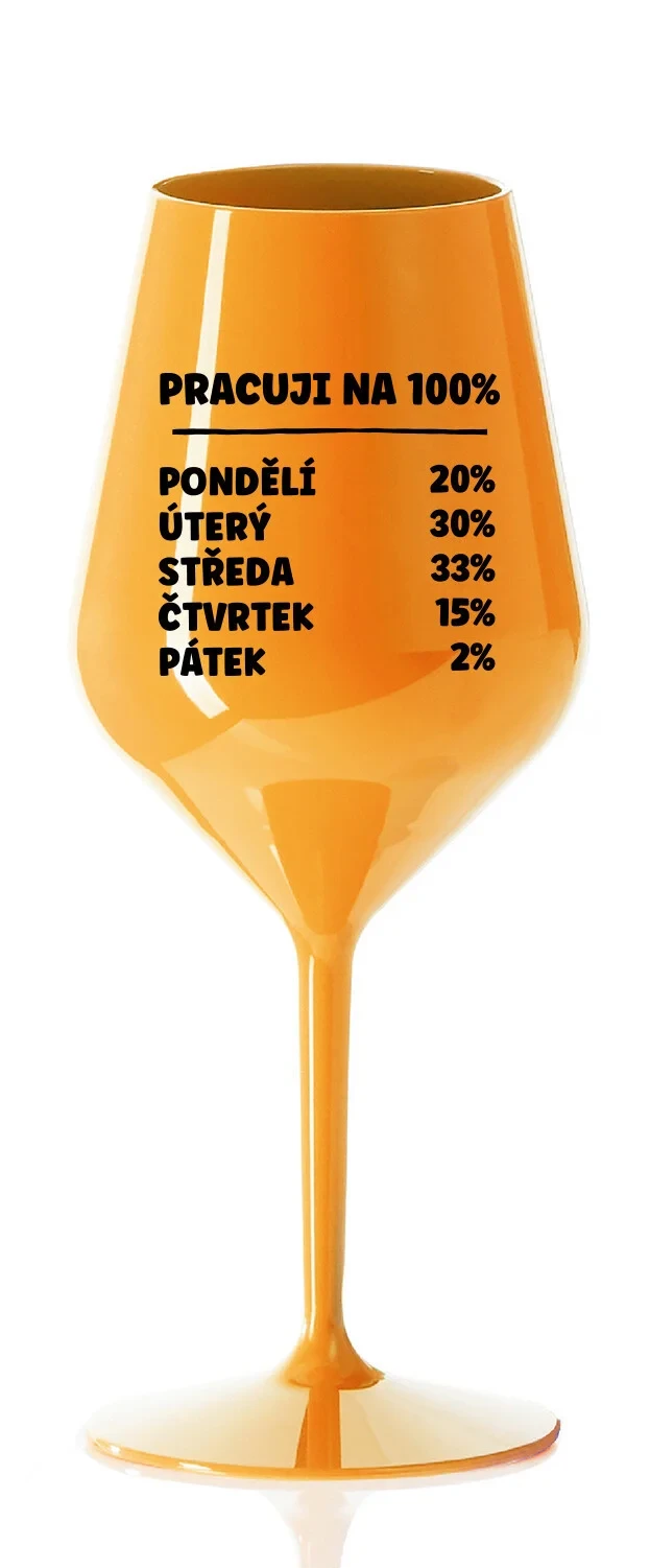 Nerozbitná oranžová vinná sklenice s motivem PRACUJI NA 100% je skvělá na zahradu, pláž, výlet, piknik a parádu udělá i při kempování. Jelikož je vyrobená z kvalitního polykarbonátu je de facto nerozbitná. Je to luxusní kousek, s nímž si víno můžete vychutnat prostě kdekoliv. Mají ergonomický tvar, který příjemně padne do ruky a protože je lehká, usnadňuje to její přenášení. Je snadno skladovatelná a lehce se čistí. Díky svému designu si s ní můžete vychutnat doopravdy kdekoliv bezproblémové pití výborného vína.