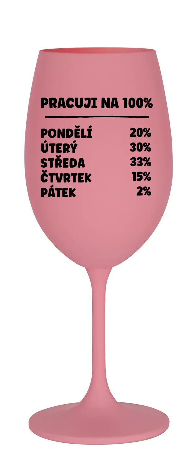 Vinná růžová sklenice s originálním motivem PRACUJI NA 100% je krásným a osobitým dárkem, které ale využijete i Vy sami třeba ve chvílích, kdy si budete chtít zpříjemnit náročný den. Tyto originální vinné sklenice jsou totiž nejen pro výjimečné události, ale i pro běžné večery, které si chcete zpříjemnit sklenkou dobrého vína. Jistě proto potěší každého milovníka vína, i toho, kdo si umí svůj život vychutnat plnými doušky.