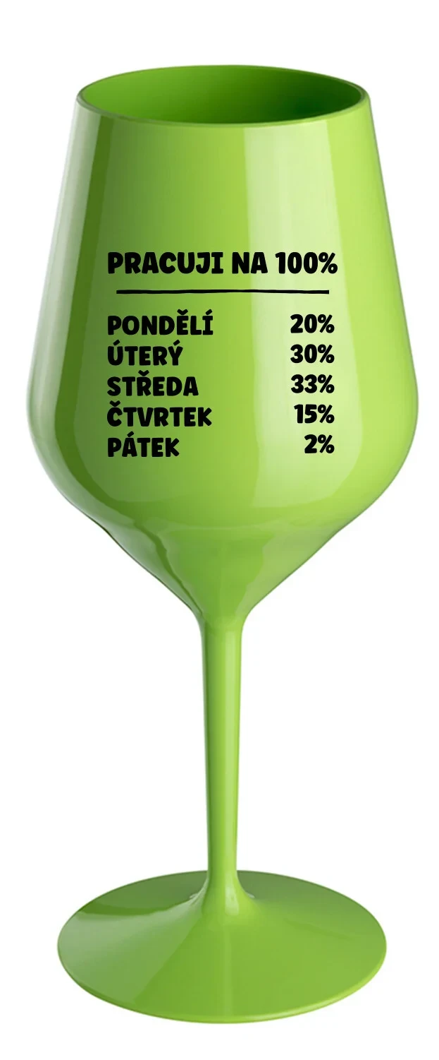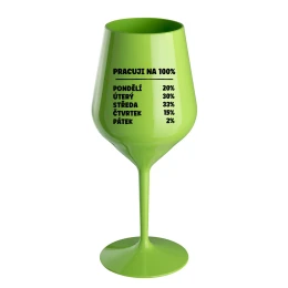 Nerozbitná zelená vinná sklenice s motivem PRACUJI NA 100% je skvělá na zahradu, pláž, výlet, piknik a parádu udělá i při kempování. Jelikož je vyrobená z kvalitního polykarbonátu je de facto nerozbitná. Je to luxusní kousek, s nímž si víno můžete vychutnat prostě kdekoliv. Mají ergonomický tvar, který příjemně padne do ruky a protože je lehká, usnadňuje to její přenášení. Je snadno skladovatelná a lehce se čistí. Díky svému designu si s ní můžete vychutnat doopravdy kdekoliv bezproblémové pití výborného vína.