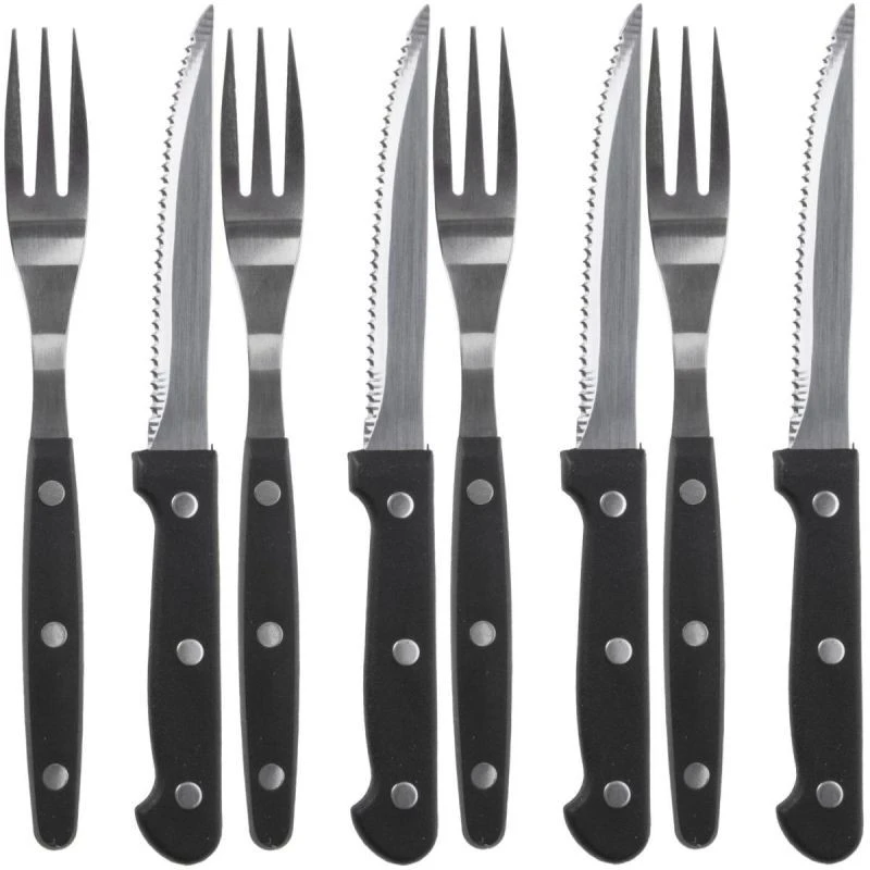 Grilovací příbor je užitečným nástrojem nejen pro konzumaci steaků, můžete jej použít i při konzumaci pizzy nebo hamburgerů. Čepel nožů je opatřena ostrými zuby a poradí si s jakýmkoli druhem potravin.