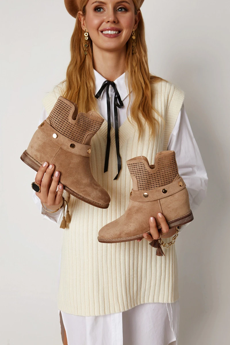 Nádherné prolamované boty se skrytým klínovým podpatkem a plochými podpatky. Mají kotníkový svršek s výřezy na bocích a perforací. Klasicky zapínané na zip, se zaoblenou špičkou. Vyrobeno z vysoce kvalitního ekologického semiše. Měkká stélka z ekokůže umožňuje pohodlné používání během dne. Je to model, který se osvědčí během mnoha sezón! Při výběru velikosti se prosím řiďte velikostní tabulkou.
