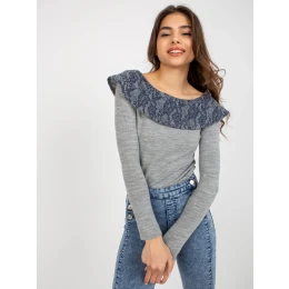 Šedá a tmavě modrá dámská halenka s ozdobným límcem .