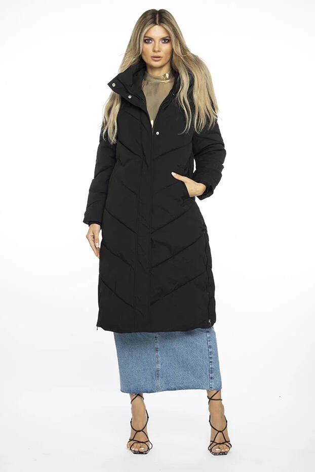 Bunda má vypasovaný střih, je zateplená syntetickou péřovou výplní, má dvě kapsy bez zapínání a zapíná se dvousměrným zipem. Model má kapuci, kterou není možné odepnout. Na koncích rukávů jsou skryté stahovací lemy. Ve spodní části modelu jsou na bocích rozparky se zapínáním na zip. Bunda má délku pod kolena.