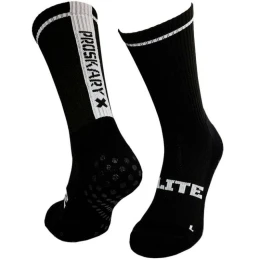Tréninkové ponožky Proskary jsou určeny pro aktivní fotbalisty, kteří ocení vysokou kvalitu. Konstrukce modelu je vyrobena z elastické tkaniny, která je odolná proti poškození a bezpečná pro pokožku. Protiskluzové gumy překrývající celou patu se postarají o stabilizaci nohy během hry. Zvětšená ventilační zóna na středu chodidla. Bezešvá konstrukce. Model v černé barvě s bílými detaily.