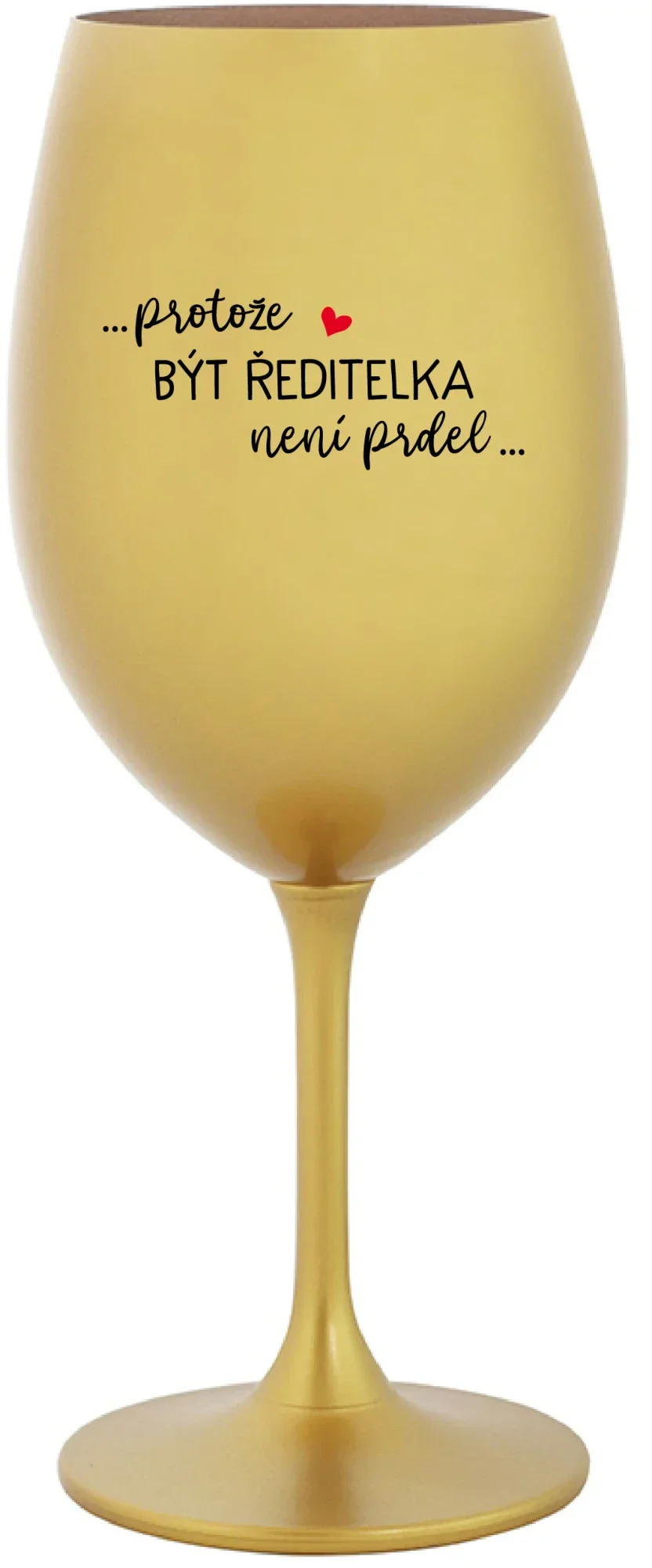 Vinná zlatá sklenice s originálním motivem ...PROTOŽE BÝT ŘEDITELKA NENÍ PRDEL... je krásným a osobitým dárkem, které ale využijete i Vy sami třeba ve chvílích, kdy si budete chtít zpříjemnit náročný den. Tyto originální vinné sklenice jsou totiž nejen pro výjimečné události, ale i pro běžné večery, které si chcete zpříjemnit sklenkou dobrého vína. Jistě proto potěší každého milovníka vína, i toho, kdo si umí svůj život vychutnat plnými doušky.