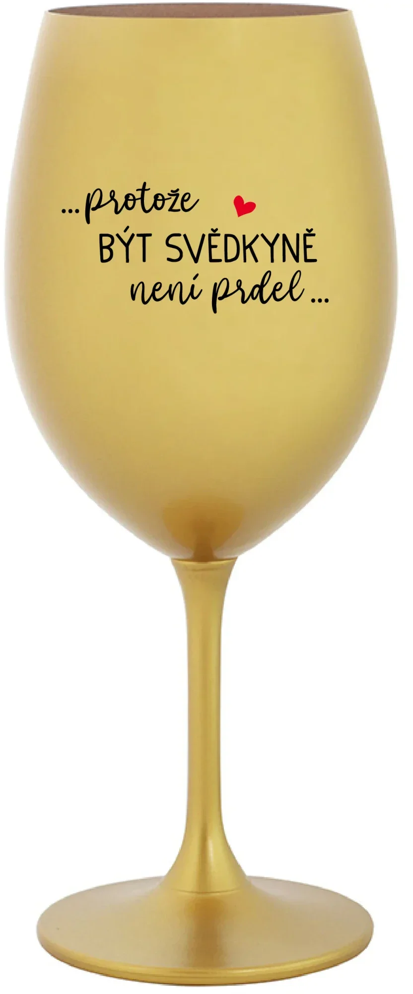 Vinná zlatá sklenice s originálním motivem ...PROTOŽE BÝT SVĚDKYNĚ NENÍ PRDEL... je krásným a osobitým dárkem, které ale využijete i Vy sami třeba ve chvílích, kdy si budete chtít zpříjemnit náročný den. Tyto originální vinné sklenice jsou totiž nejen pro výjimečné události, ale i pro běžné večery, které si chcete zpříjemnit sklenkou dobrého vína. Jistě proto potěší každého milovníka vína, i toho, kdo si umí svůj život vychutnat plnými doušky.