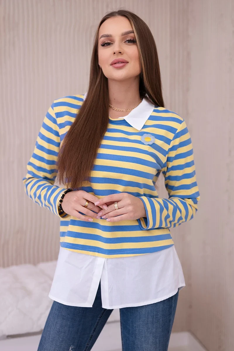 Pruhovaná bavlněná halenka s límečkem džínovina+žlutá