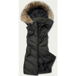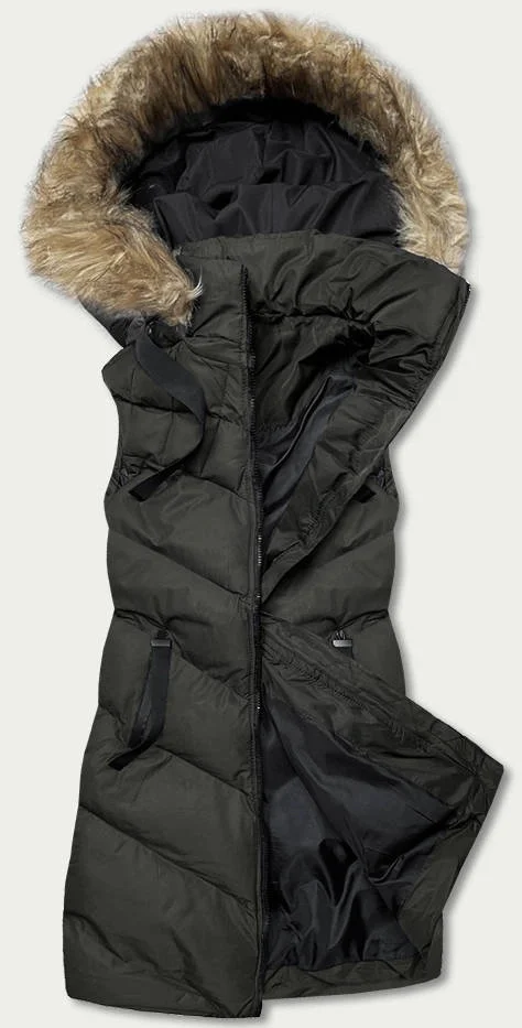 Dámská péřová vesta v army barvě s kožešinou (5M787-136)
