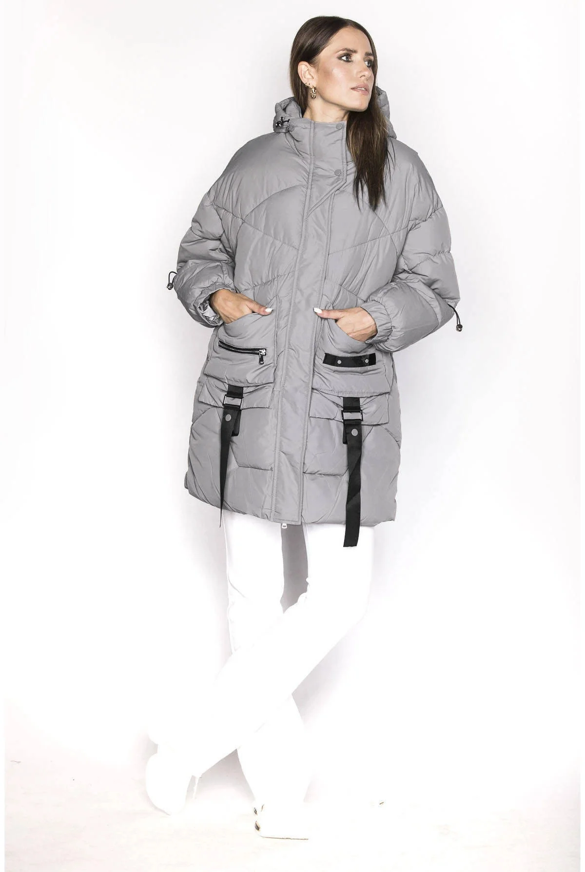 Šedá dámská péřová bunda s ozdobnými páskami (AG2-J85)