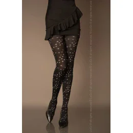 Novinka! Stylové punčocháče pro zimní styling - černé s malými, světlými, roztomilými hvězdičkami. Tloušťka 80 DEN vás udrží v teple a pohodlí. Hvězdičky vypadají krásně a okouzlujícím způsobem zdobí nohy. Dokonale nahradí vaše známé hráškové nebo květinové dekorace. Složení: 86 % polyamid, 14 % elastan.