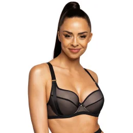 Stylová push-up podprsenka. Béžové košíčky a můstek pokryté černou síťovinou, ozdobná elastická ramínka, zapínání a regulátory ve zlaté barvě. Mezi košíčky mašlička a bižuterní ozdoba, vyjímatelné zvětšující vložky. Ramínka nastavitelná, neodnímatelná. Zadní část z černé síťoviny, bez svislých bočních velkých kostic. Vzadu zapínání na háčky a očka. Do soupravy doporučujeme kalhotky Denise.