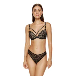 Push-up podprsenka v černé barvě. Košíčky z tenké korzetové pěny zdobené krajkou. Košíčky podprsenky mají na vnitřní straně kapsy s push-up vložkami. Výstřih je zdobený ramínky. Eleganci dodávají zlaté detaily. Vnitřní strana košíčků je podšitá bavlnou podle normy OEKO-TEX, takže je šetrná k pokožce. Zadní část podprsenky je vyrobena z elastického tylu. Svislé boční velrybí kostice stabilizují obvod podprsenky. Podprsenka byla navržena a ušita v Polsku.