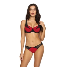 Elegantní push-up podprsenka vyrobená z kombinace červené pleteniny s jemným potiskem černých puntíků a elegantní krajky, která byla navíc podél ramínek vypuštěna, aby jí dodala smyslný nádech. Krajkový můstek, vyjímatelné zvětšující vycpávky, mašlička mezi košíčky s visačkou. Nastavitelná, neodnímatelná, prodloužená krajková ramínka. Zadní díl z elastické síťoviny, zapínání na háčky a očka.