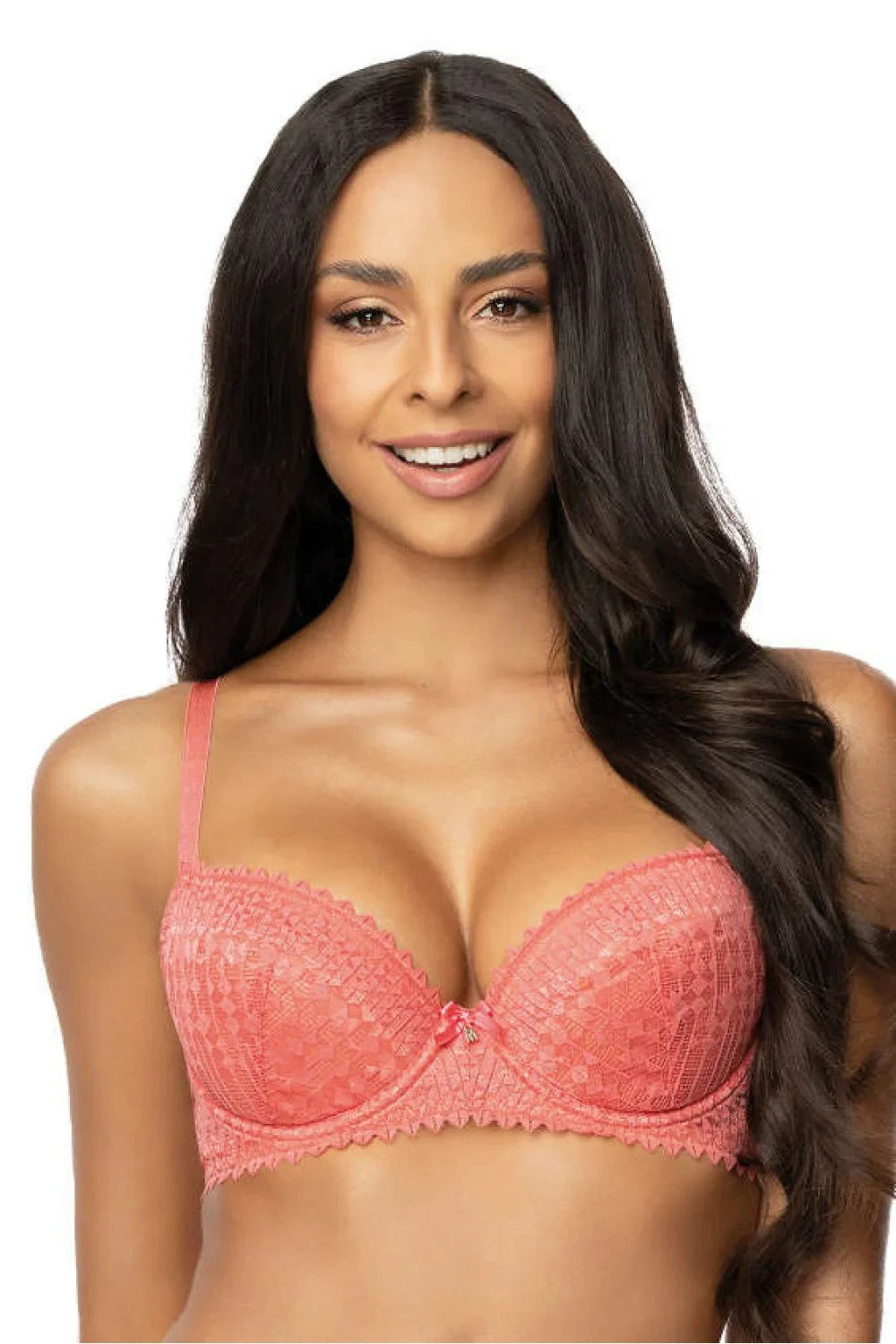 Fenomenální model Maddie v korálové a modré barvě, klasický push up ve zázračném provedení. Podprsenka je celá vyrobena z geometrické krajky. Model má vyjímatelné vložky a neodnímatelná ramínka s možností regulace. Dvojitý háček s třístupňovou regulací.