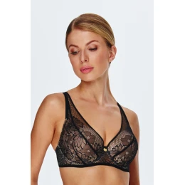 Biustonosz posiada miseczki usztywnione z wkładkami żelowymi, które zapewniają dodatkowe wsparcie i podkreślają biust, nadając mu pełniejszy kształt. Miseczki pokryte koronką, która subtelnie łaczy się z ramiączkien nadają lekkości. Obwód biustonosza oraz mostek są ozdobione delikatną koronką, co dodaje elegancji i kobiecości.